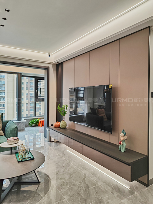 電視背景墻采用護墻板+隔柵板搭配懸浮電視柜,盡顯時尚感。
