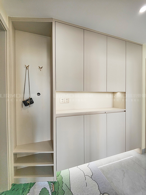 全屋衣柜、櫥柜、房門、護墻板都選用奶咖色系配套。