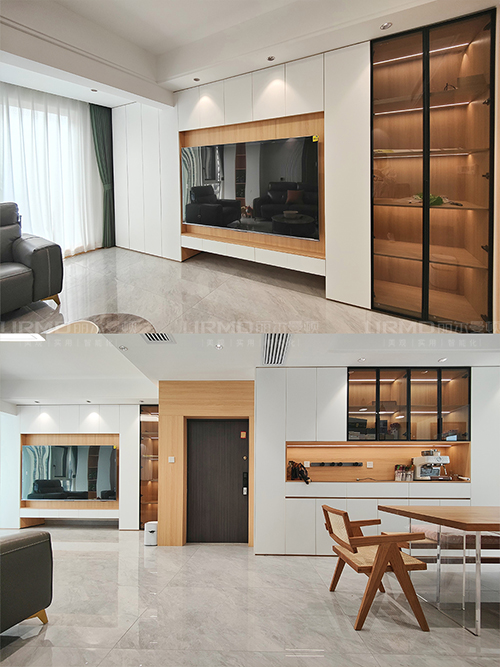 電視背景墻采用整面墻做儲物柜設(shè)計,