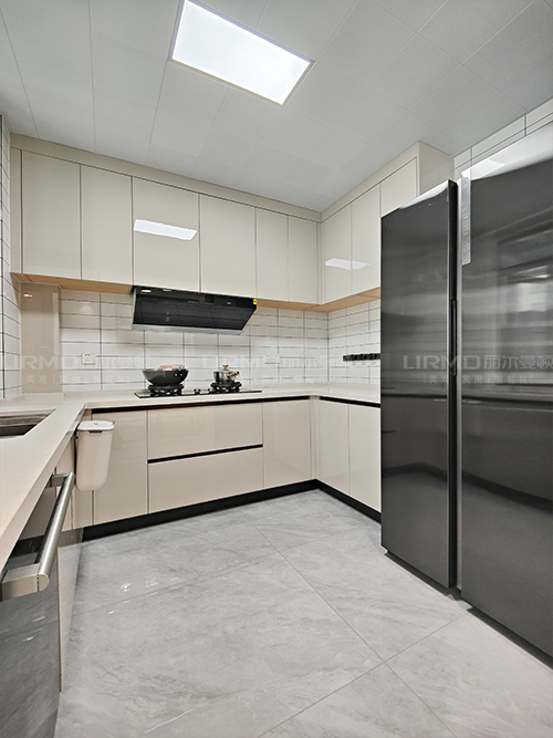櫥柜選用高光柜門,抗手印耐油污,還可以增加廚房亮度顯寬敞