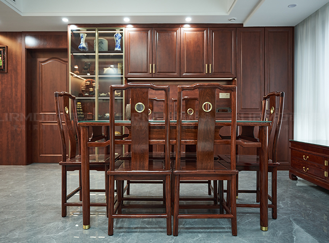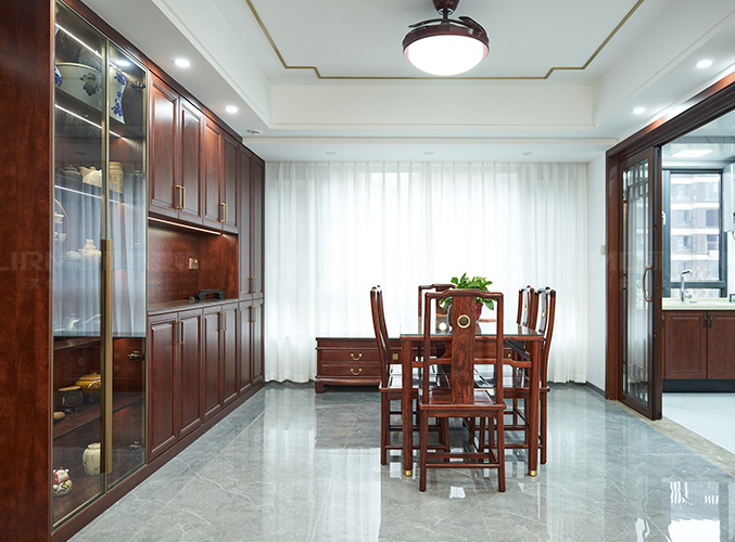 一整墻餐邊柜,中間臺(tái)面預(yù)留了插座,可放置一些小家電,玻璃柜門放茶具和瓷器等裝飾,