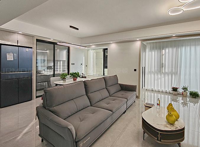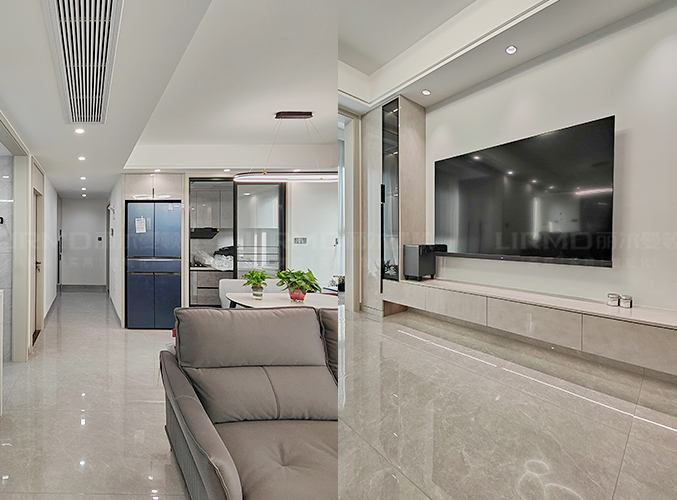 全屋通鋪瓷磚,顯達敞亮,冰箱做內嵌處理不占空間,灰白紋理的電視背景墻,