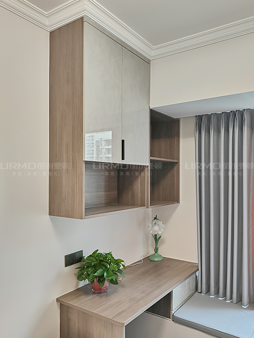 臥室選用一門到頂設計收納空間超大,右側加入分割式柜體擺放書物何一些其它物品,
