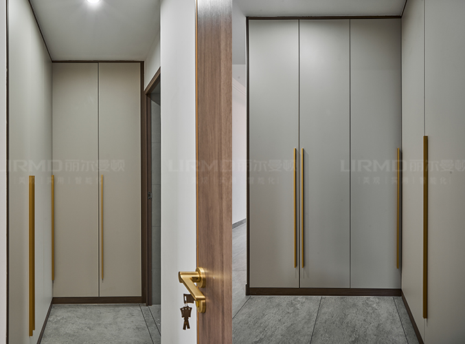 實木柜體搭配PET膚感柜門,衣柜+學習桌的組合,收納更加方便,走廊搭配一門到頂柜子,