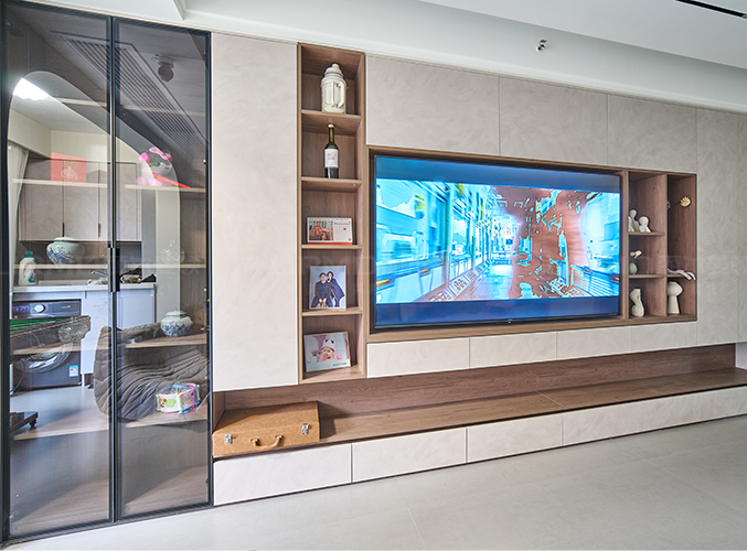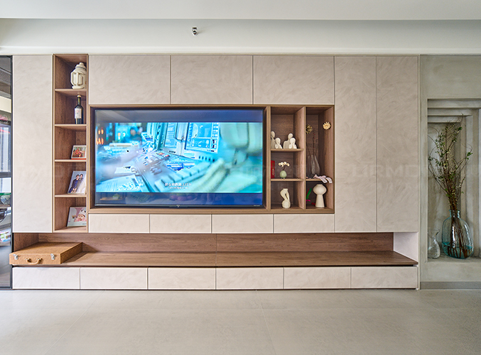 整屋通鋪瓷磚,盡顯大氣,電視背景墻設計幾盒壁龕放置擺件,與嵌入式電視柜融為一體,