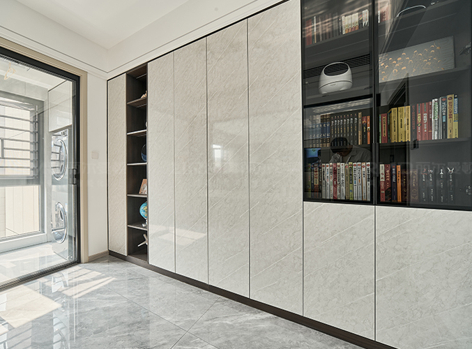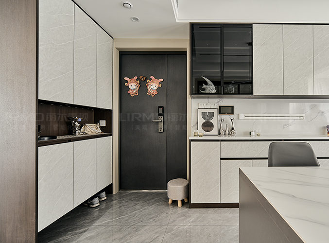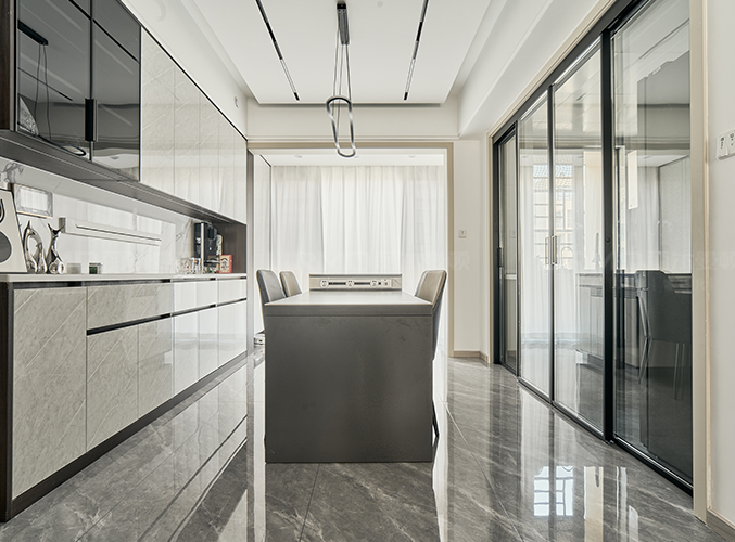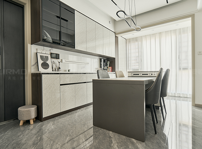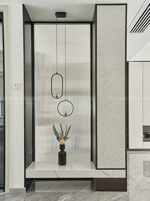 可以放置鑰匙包包等物品。玄關長虹半透玻璃結合柜體穿插設計,更顯時尚。