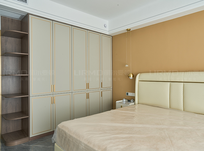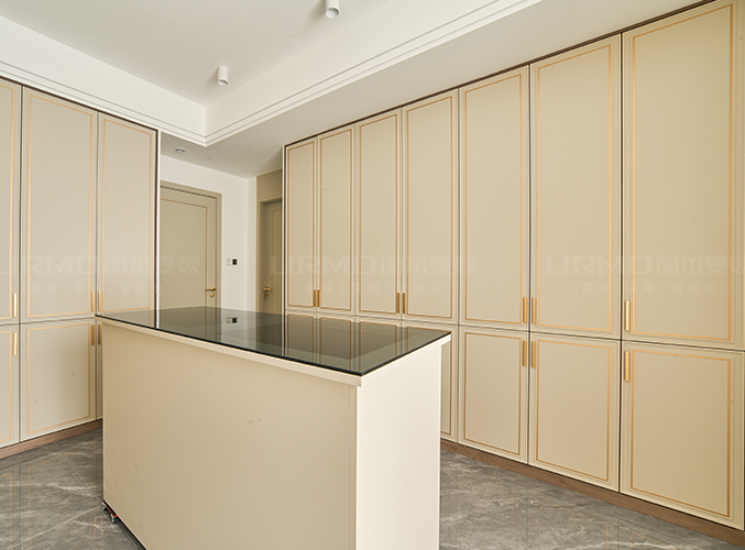 整面墻做衣柜,更加好分類,柜子象牙灰色鑲嵌金屬邊框,側邊做一個圓弧角處理,