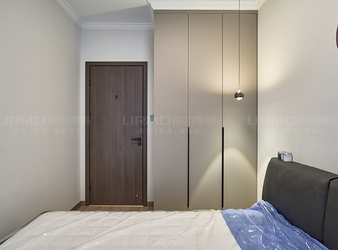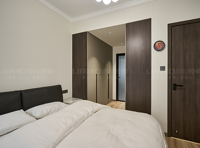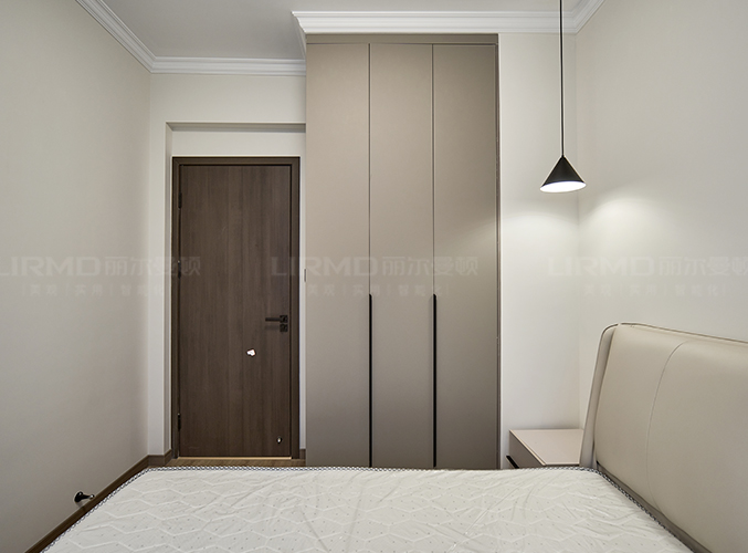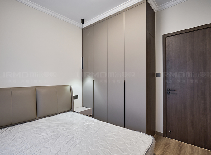 臥室延續(xù)極簡風格,衛(wèi)生間通道兩側到頂衣柜做衣帽間,暖色燈光搭配木紋地板營造溫馨氛圍。