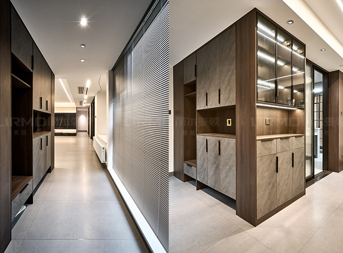 18mm厚杉木芯板,長廊兩側(cè)分別置鞋柜和儲物柜,視覺效果更好,下方懸空設(shè)計,好放置鞋子,