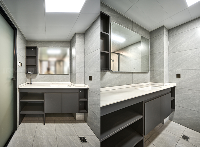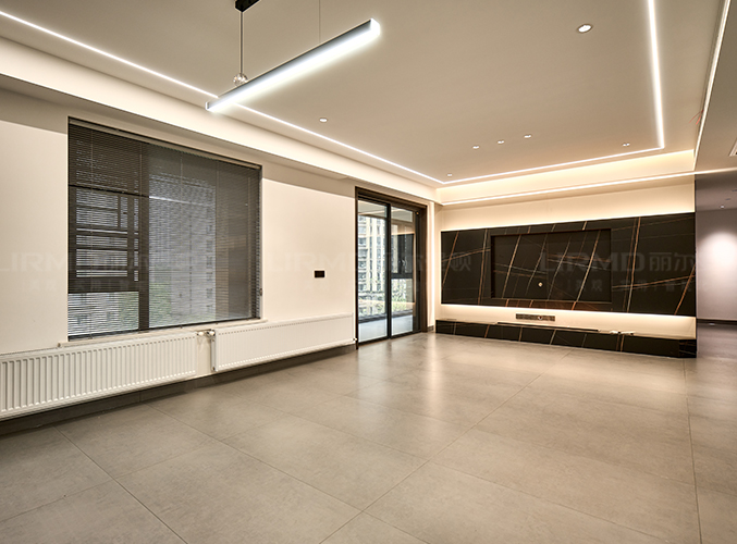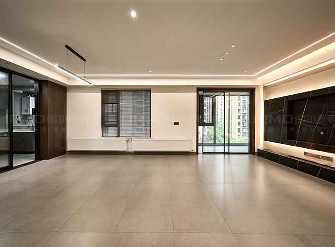 啞光淺灰地磚大氣整潔,疊級吊頂+無主燈設(shè)計增添高級感。