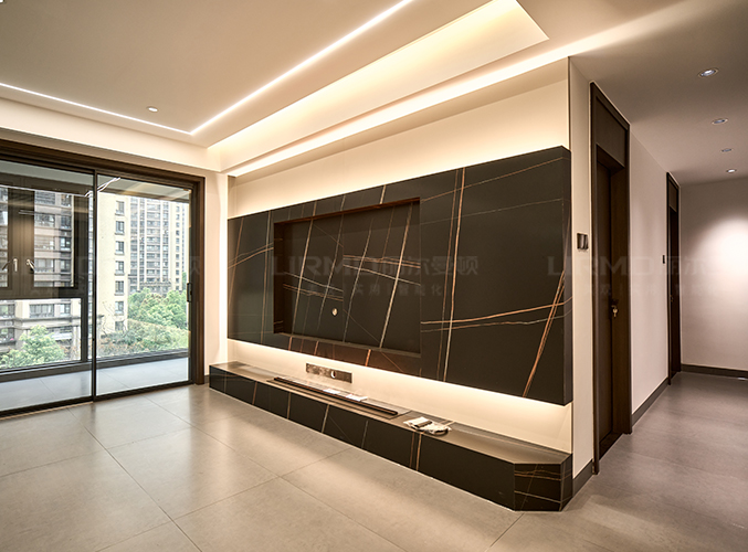 電視背景墻采用黑色紋理石板點綴空間,整墻做內(nèi)嵌電視背景墻,不占空間,