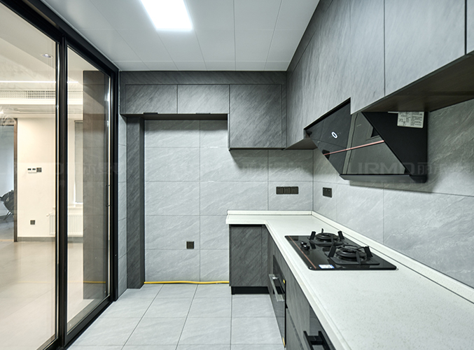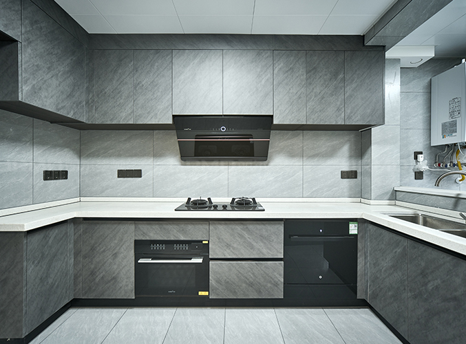 U型設(shè)計,櫥柜灰色超晶飾面搭配淺色橫磚整體統(tǒng)一,上下都有柜子,方便收納。