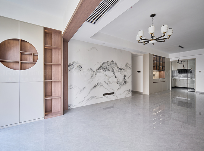 客廳大瓷磚通鋪,背景墻采用山水畫(huà)裝飾增添中式韻味。