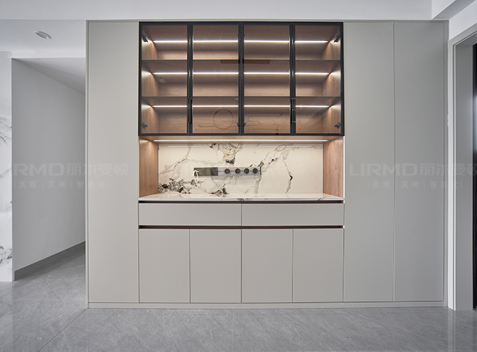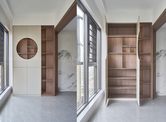陽(yáng)臺(tái)與客廳取消隔斷,空間更通透,柜門(mén)做圓形鏤空造型,氛圍拉滿。