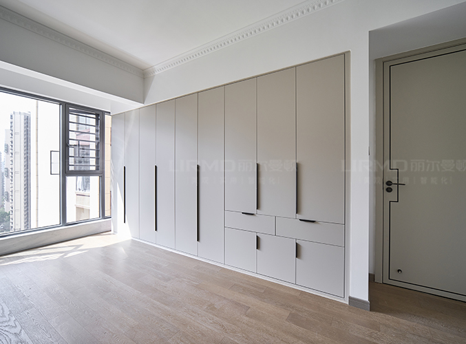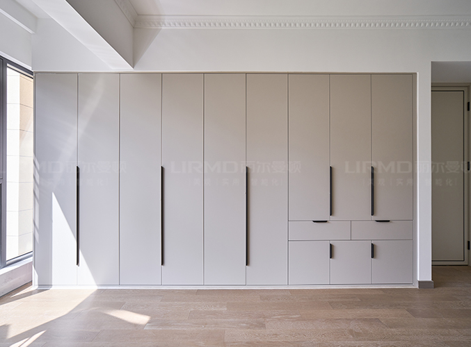 實(shí)木柜體搭配PET膚感柜門(mén),質(zhì)感超不錯(cuò),同款膚感滿墻衣柜,極簡(jiǎn)黑色金屬拉手簡(jiǎn)單大方易打理,