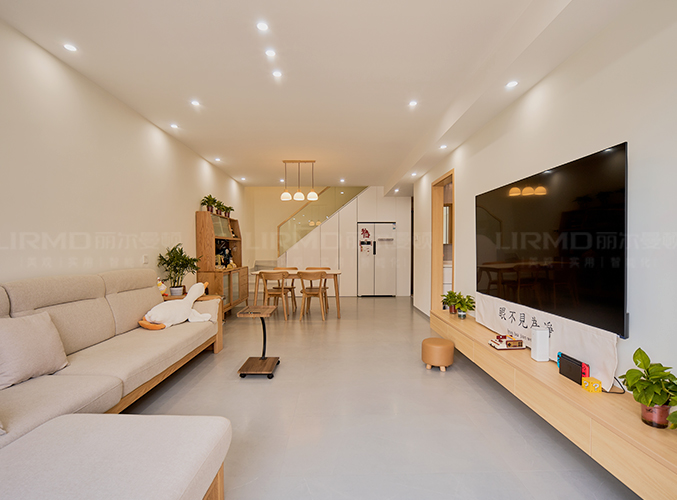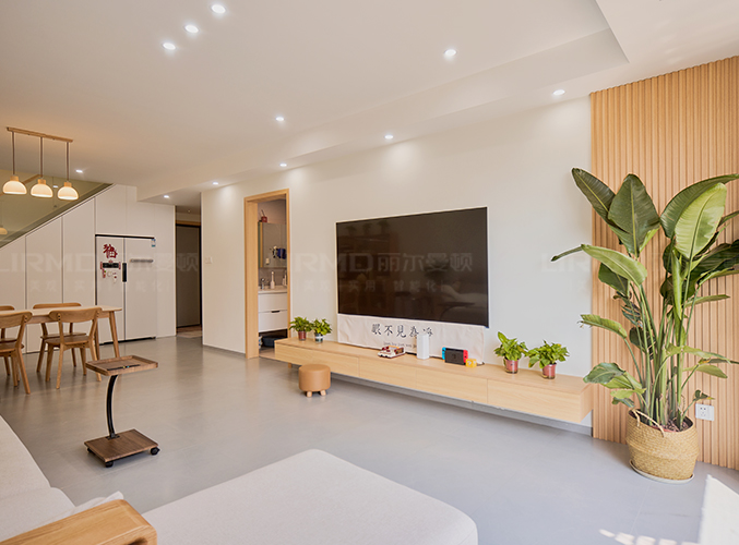 電視背景懸浮柜設(shè)計,整塊墻做電視背景墻,盡顯大氣,無主燈設(shè)計搭配大白墻,