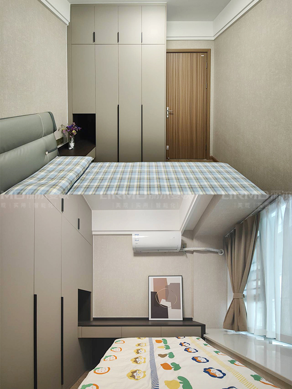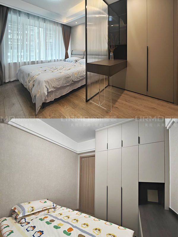 全房共定制了8個柜子,柜體采用足18厚杉木芯板,柜門采用LSB板PET膚感柜門,一門到頂,五金使用原裝進口的百隆五金