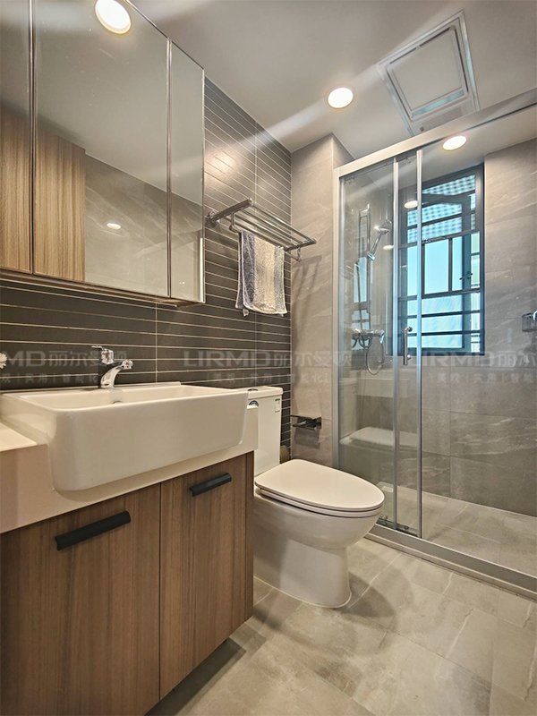 馬可波羅大板磚、箭牌衛浴、圣象地板、以及與全房定制衣柜同款同色同造型的定制房門和鋁合金門、恒潔潔具等