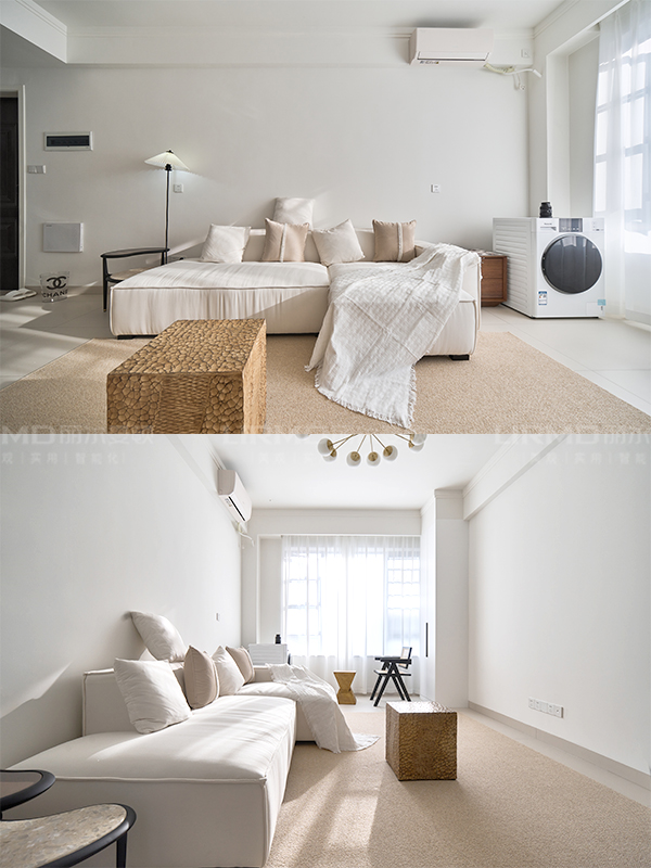 所以,設計師在軟裝上,融合了少量深色和藤編材質,提升整個空間的質感和格調。