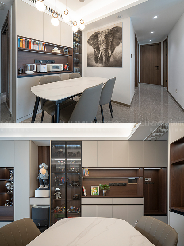 餐廳靠墻做了一組薄柜,比普通的餐邊柜更薄,適合放小家電書本,又不影響餐廳整體的面積