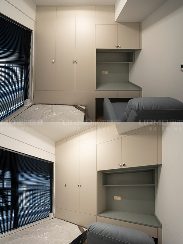 這一戶中間戶型,入戶鞋柜柜體不動,把柜門改成與全屋定制柜配套的象牙灰柜門,