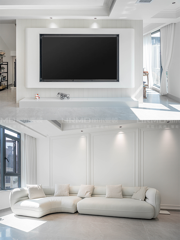 拉伸比例,電視墻注重實用以及視覺的拉伸,沙發背景制造視覺框效果
