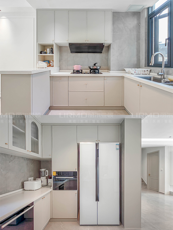 柜門板造型采用經典的法式弧形線條,搭配黃銅拉手,小燈芯玻璃門透出暖色燈光,提升家居氛圍感,