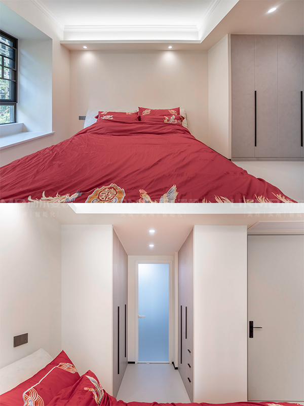長沙靠譜裝修公司,長沙靠譜全屋定制,臥室衣柜加梳妝臺,現(xiàn)代侘寂風,
