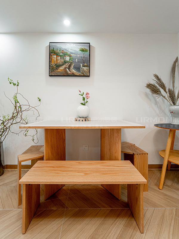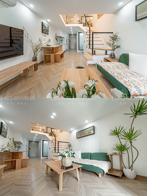 一樓是客廳區,魚骨紋地磚通鋪,全屋原木色搭配白色,電視機旁邊墻面做了弧形鏤空收納區,美觀又實用。