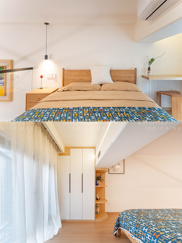 二樓使用與柜子顏色相仿的木地板。床、家具、定制衣柜、書桌都采用原木風,將原木風貫徹到底。