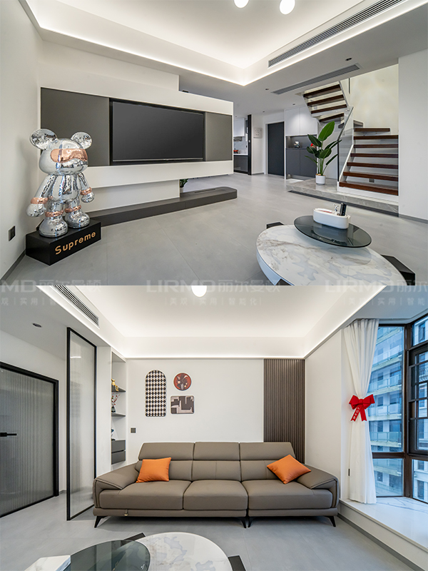 客廳做了懸浮電視背景,正對沙發采用背景墻+長虹屏風隔斷。