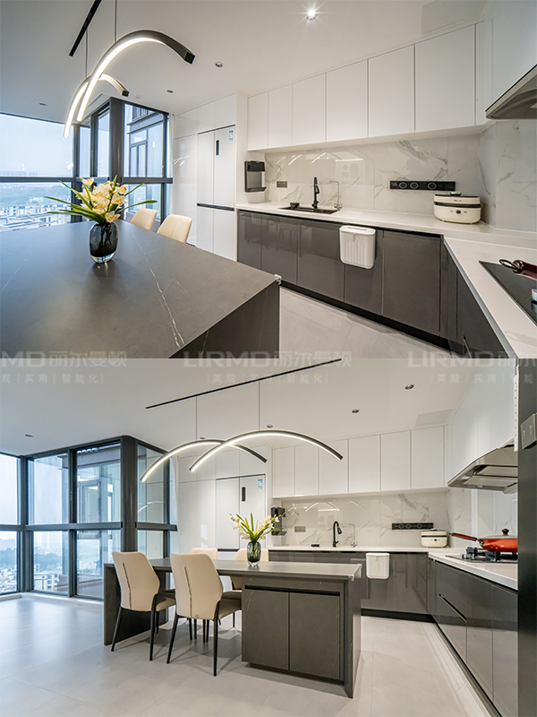 進門右手邊是整套定制開放櫥柜+餐島臺一體設計,