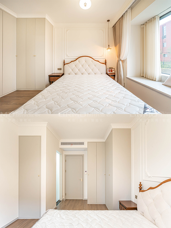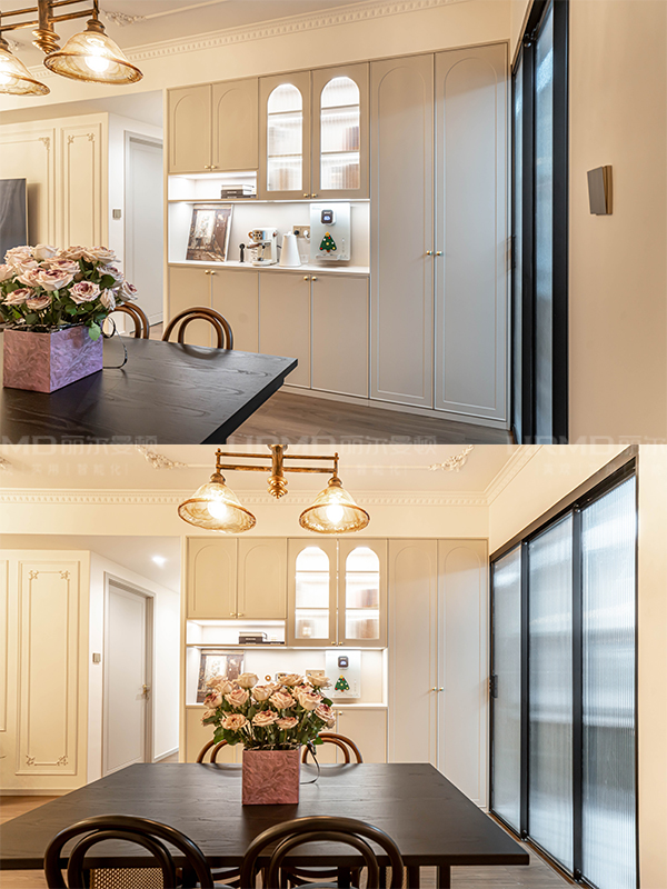 整體定制采用象牙灰加同色系柜門,搭配圓柄金屬拉手,增加了法式的優(yōu)雅