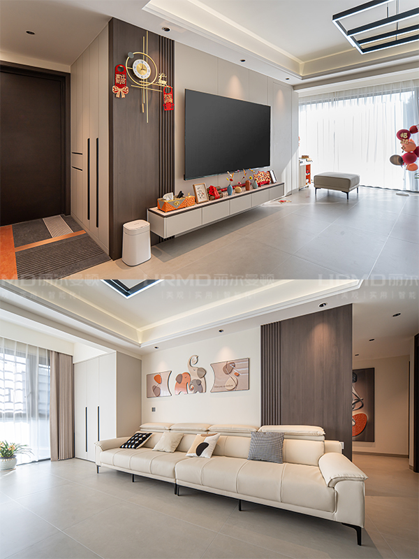 入戶柜連接電視背景墻做同色系護(hù)墻板設(shè)計(jì),簡(jiǎn)單又高級(jí)