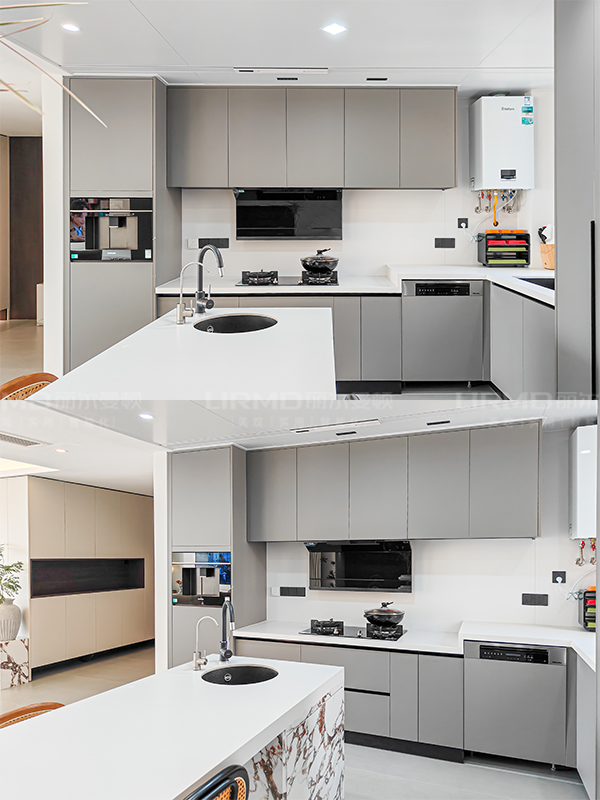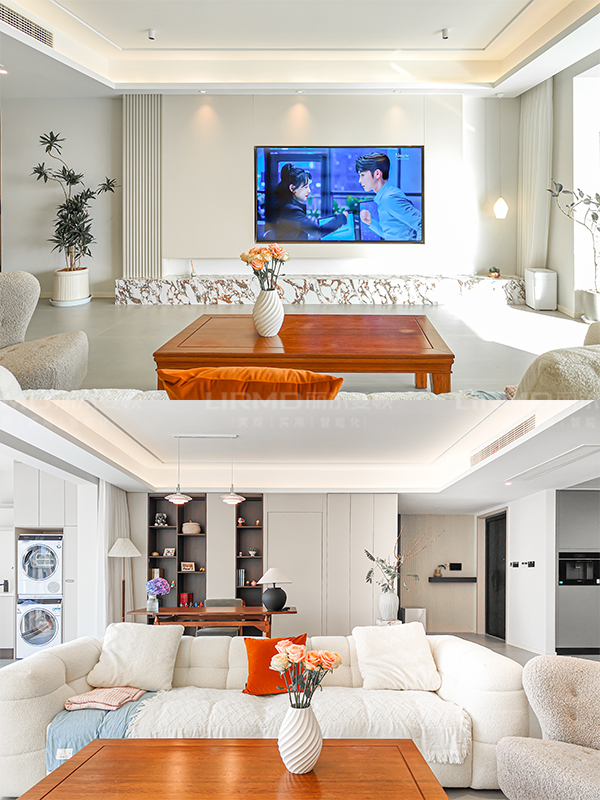 ?將地面瓷磚更換為素色柔光磚,全屋定制柜、護墻板及超高門做啞灰橡局部穿插煙熏尤加利做跳色,打造現代輕奢風。