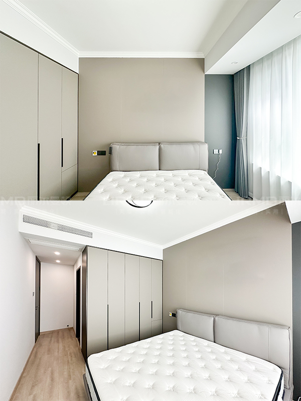 主臥床假懸浮式安裝人體感應燈帶,飄窗一個顏色的墻板和諧統一