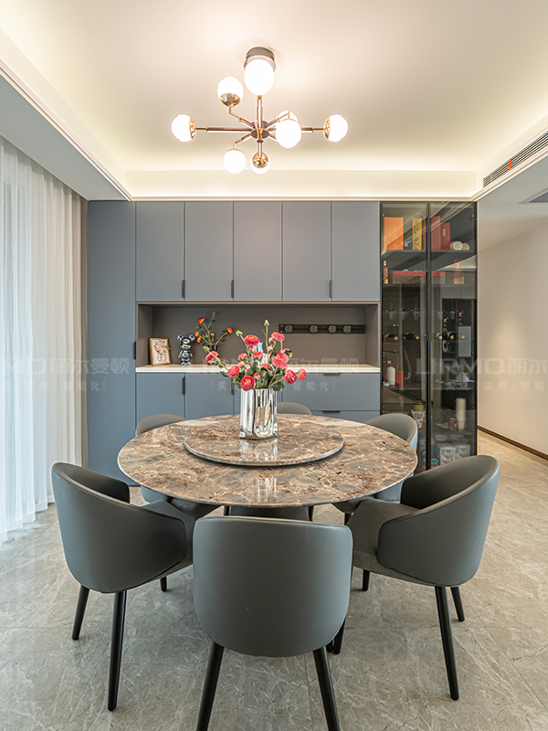 客廳沙發背景用硬包提升質感,餐邊柜做了玻璃門+玻璃層板形式,更顯高級感