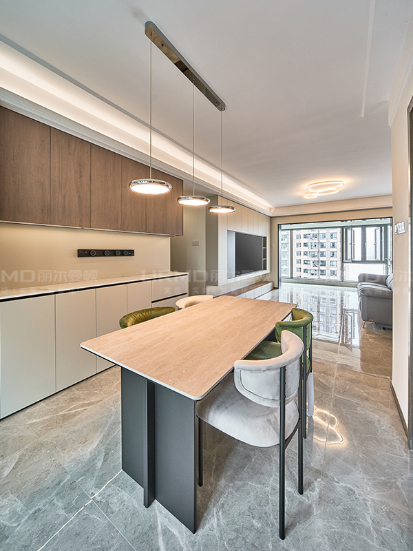 餐邊柜全系無(wú)拉手設(shè)計(jì)搭配金絲橡木的撞色搭配,視覺(jué)感官上盡顯盛宴