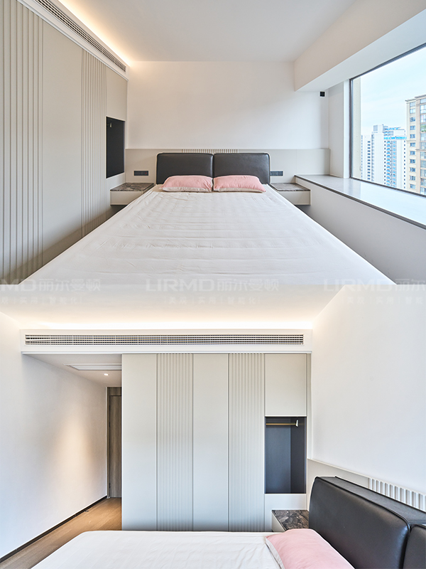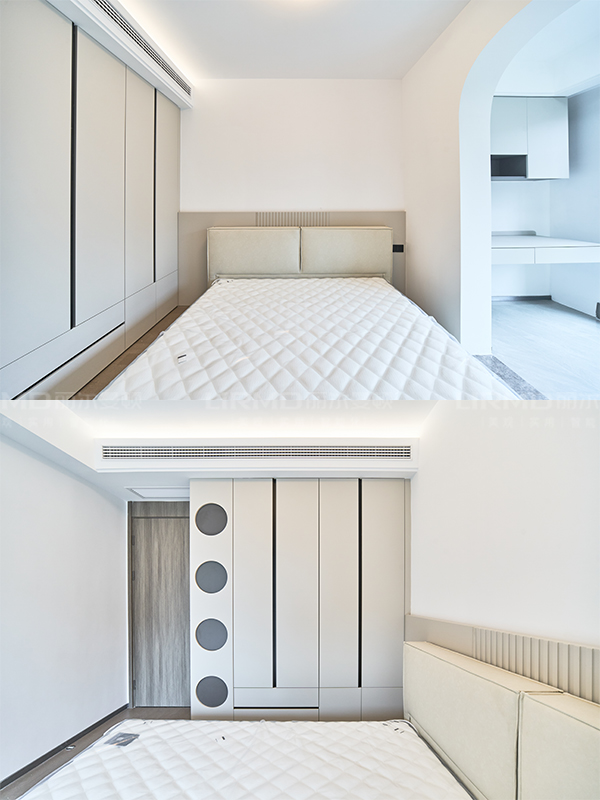 L 型衣柜的收納力強,空間利用率更高,堪比一個衣帽間,避免主衛對著床,提升居住體驗