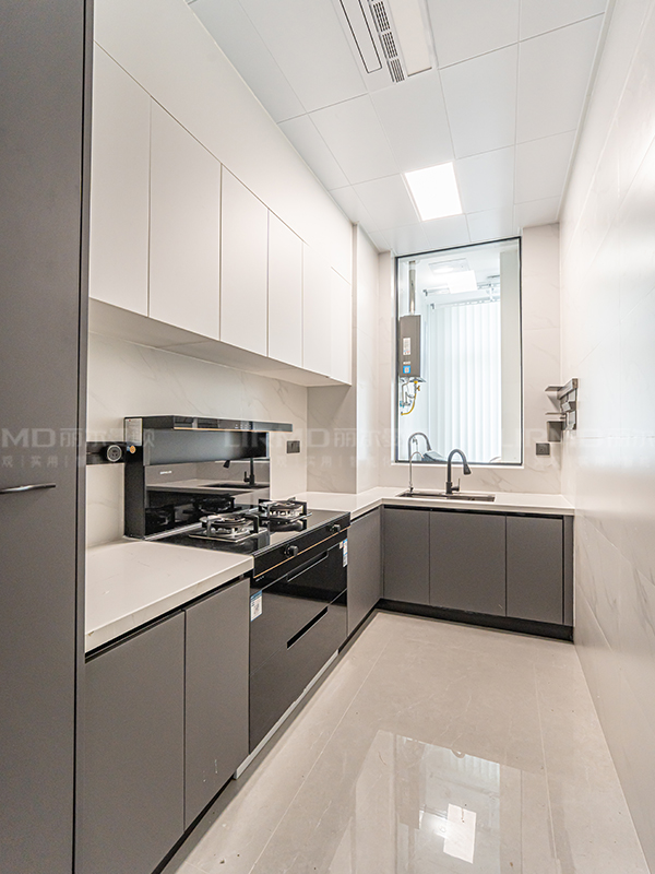 L 型櫥柜以白色和灰色為主色調,簡潔大方,易于清潔和維護