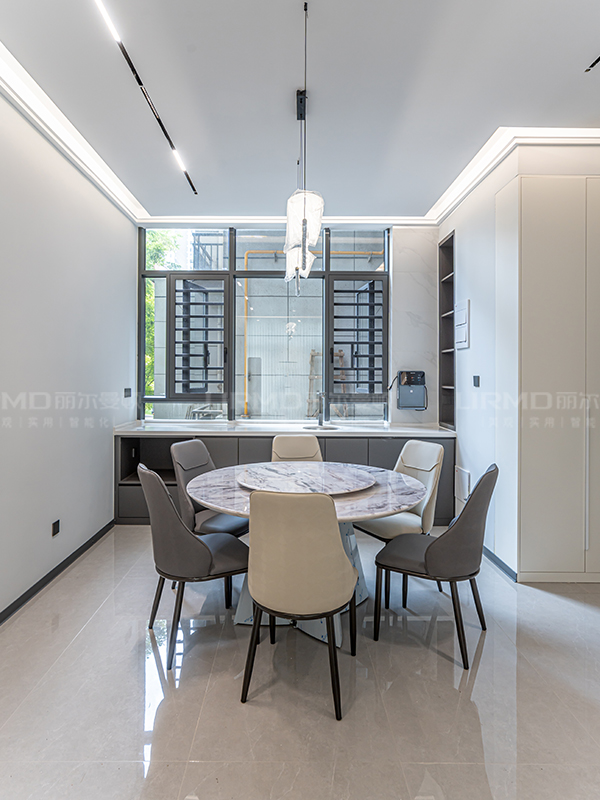 客廳以白色為主,采用開放式布局,餐桌和餐椅線條流暢,色彩統一簡約的線條空間感滿滿