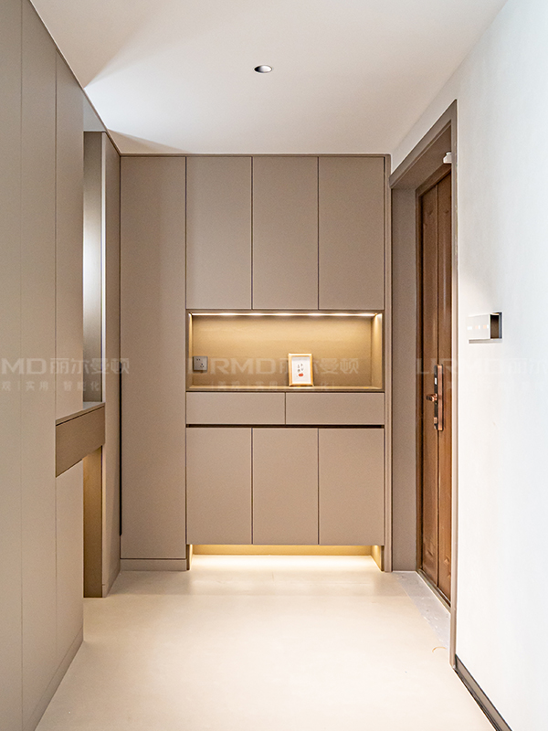 改造L型玄關收納柜,玄關柜采用穿插設計手法,打破常規鞋柜格局,呈現進門即是景的視覺沖擊力