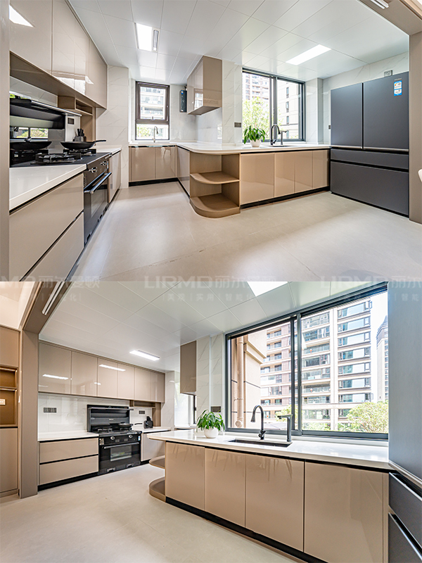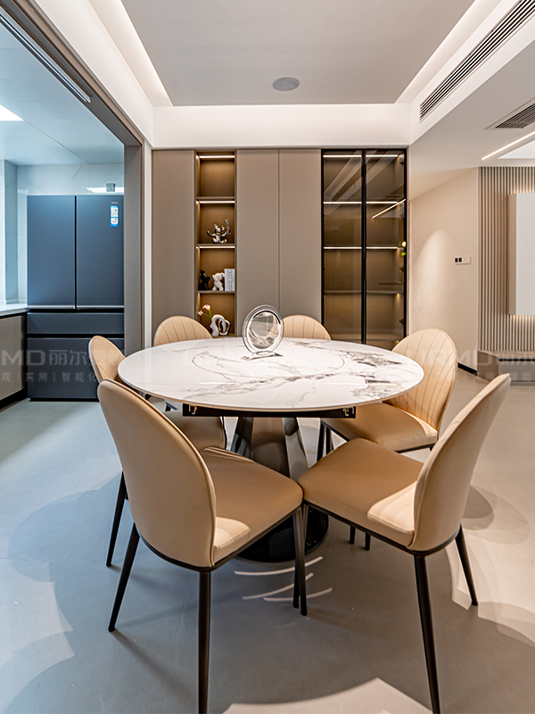 整體采用U型無拉手卡槽設計,更能貼合生活細節,書柜位置搭配玻璃展示柜,讓空間層次感更加分明,整體設計新穎別致