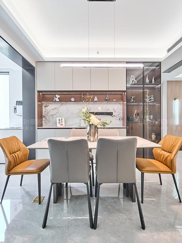 家具軟裝的搭配,不同材質進行混搭,深色的實木餐桌淺色的布藝沙發(fā)互相呼應,綠植的點綴為整個空間增添了些許生命力