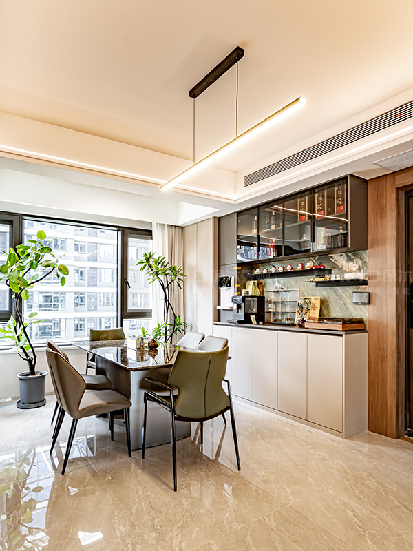 暗綠色奢華巖板裝飾,和餐邊柜互相呼應,打造低調的奢華視覺享受。