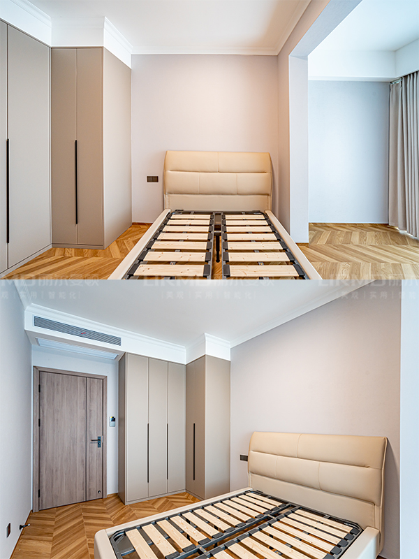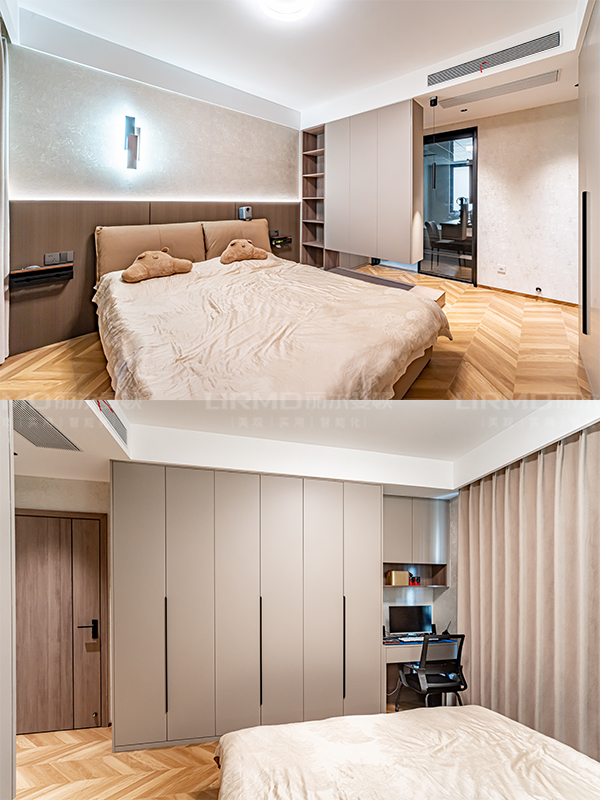 主臥大套間,整面墻做收納衣柜,結合半墻造型隔斷,讓空間不顯單一。