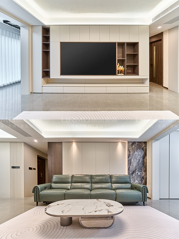 電視柜做嵌入式,收納和開放格結合。沙發背景墻格柵+威尼斯棕花色結合,簡約不失設計感