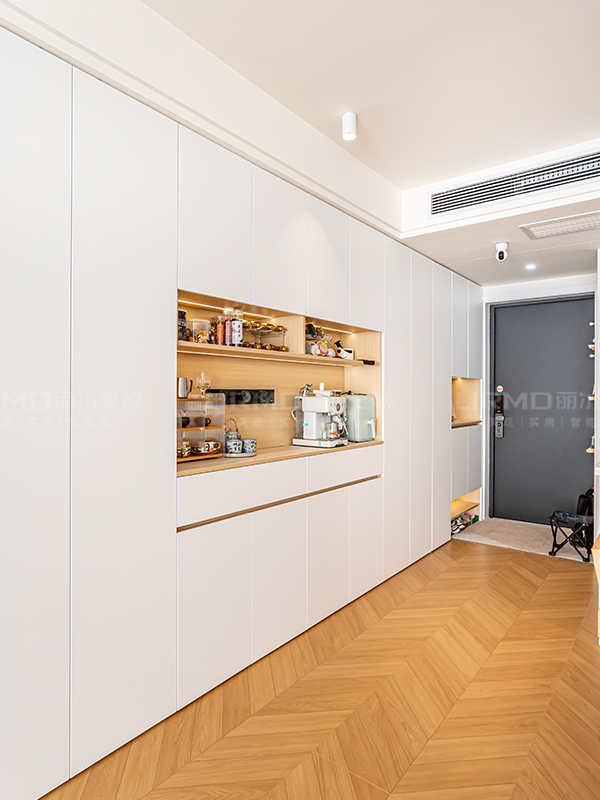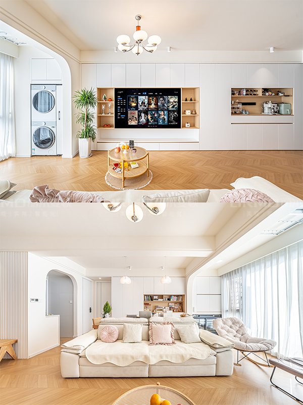 琥珀白電視柜,搭配原木色的裝飾板,既不喧賓奪主,又增添了幾分自然氣息