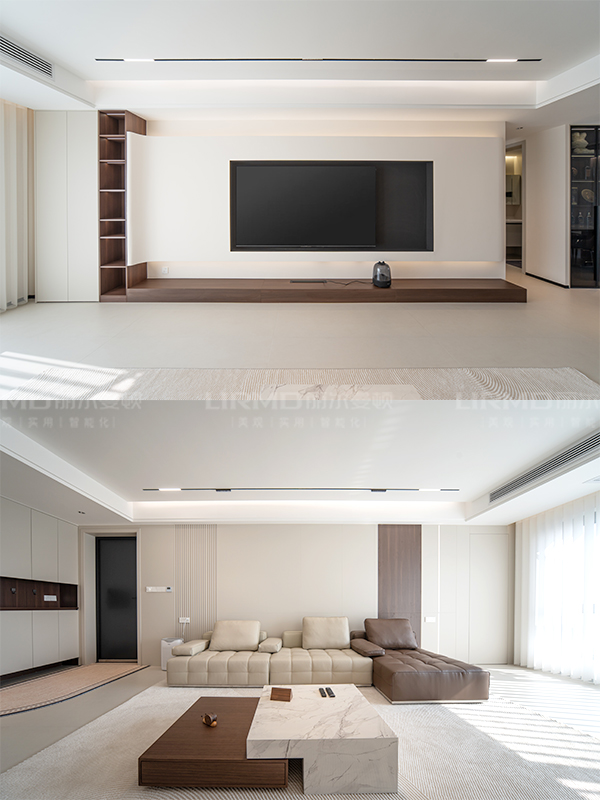 弧形懸空電視墻內(nèi)嵌燈帶,弧形設(shè)計,使電視背景墻左右側(cè)平緩過渡,內(nèi)部安裝氛圍燈,烘托出家的暖意